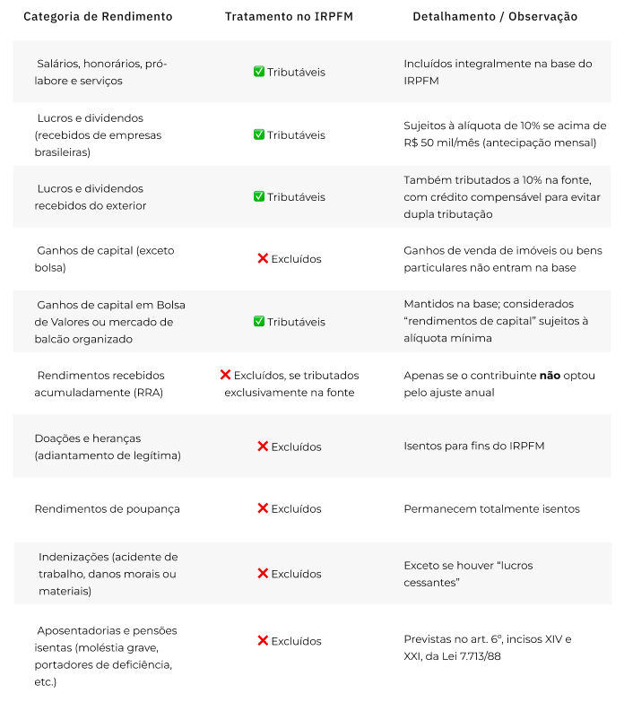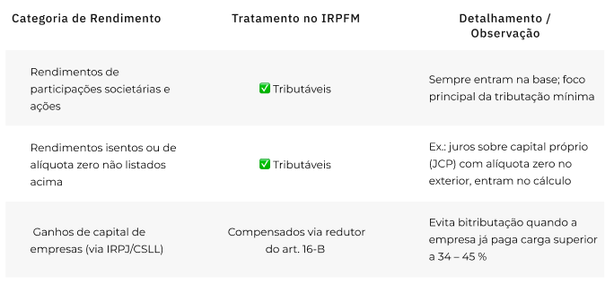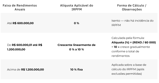 O principal impacto está na tributação das distribuições de dividendos, prática comum no mercado financeiro para assessorias e consultorias. A PL institui o IRPFM, com alíquotas de 0% a 10% para rendas superiores a R$ 600 mil por ano. A alíquota máxima de 10% aplica-se a rendimentos acima de R$ 1,2 milhão anuais.