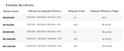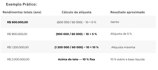 2- Será definida a alíquota padrão que será aplicada ao seu imposto de renda. Sendo esta uma tabela escalonada, que se inicia com 0 para 600 mil e chega ao teto de 10% para 1.2M.