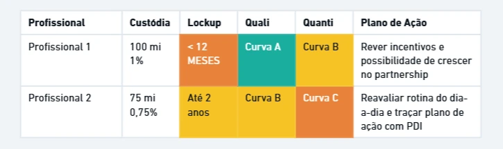 Com esse mapa, você consegue abrir de forma clara qual é a custódia que está “vencendo”. Nesse caso acima estamos falando de 2 bi. Com nossa plataforma, você consegue, de forma automatizada via gestão de contratos, entender quais são os clientes e profissionais que representam isso. A partir dai, conecta as informações de avaliação de desempenho, 1:1s e BI e toma o plano de ação de forma assertiva e rápida: